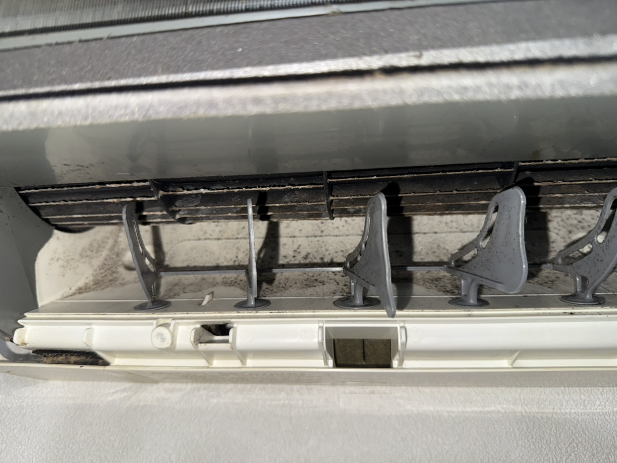 特にリビングのエアコンは、日常的に喫煙されていることもあり、タバコのヤニ汚れや独特の臭いが本体内部まで染みついている状態。外観は黄ばみが目立ち、フィルターや吹き出し口には黒カビも確認できるとのことでした。