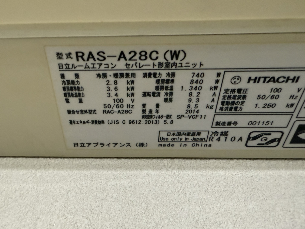 🔧 機種:日立 壁掛けタイプ(2014年製 RAS-A28C/お掃除機能なし)